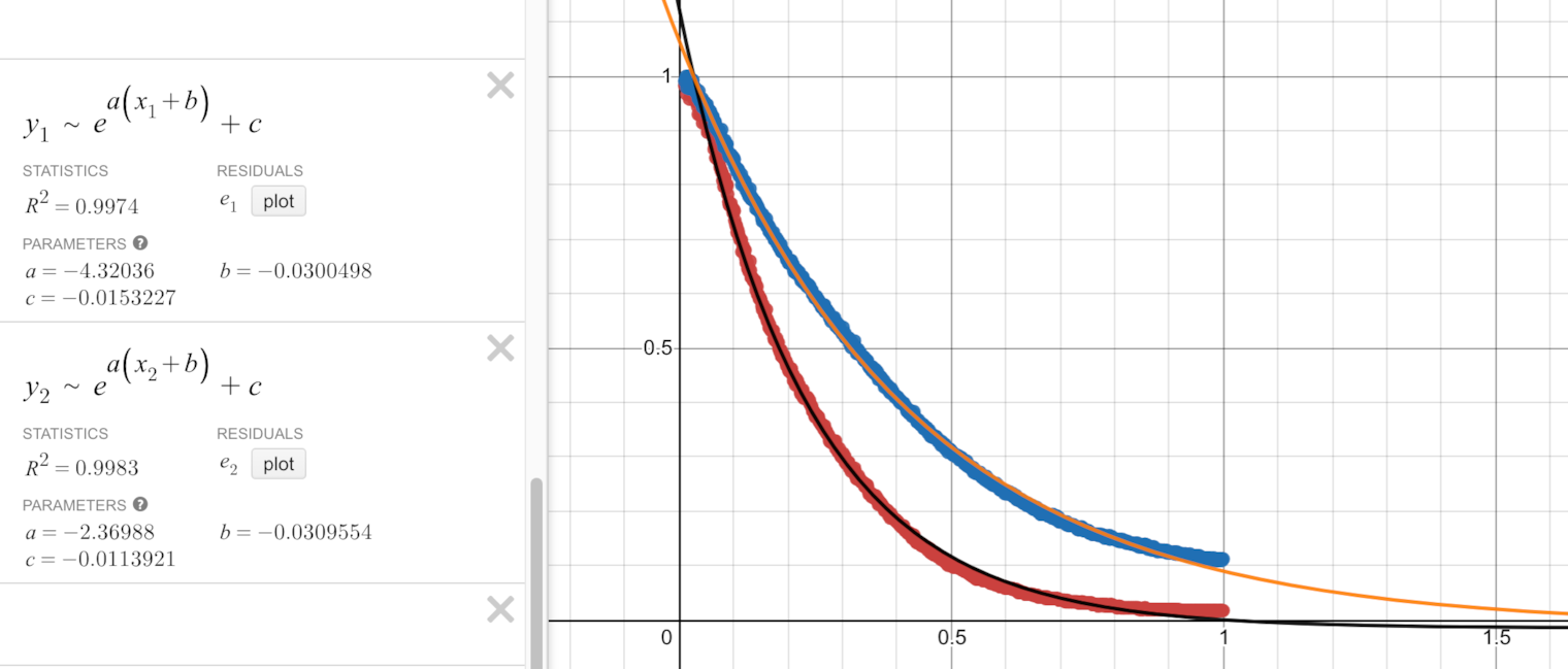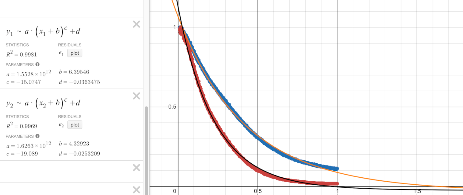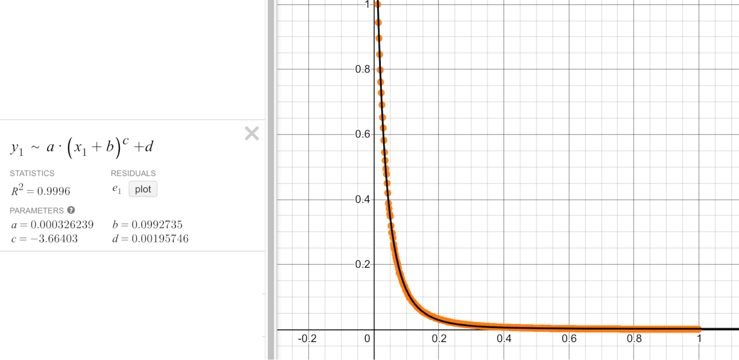 Desmos has an amazing curve-fitting / non-linear regression tool, let's see what kind of curve we can fit on our data.