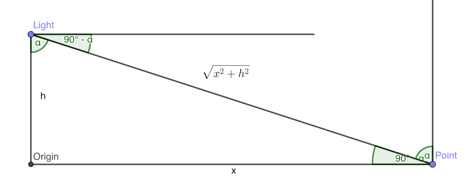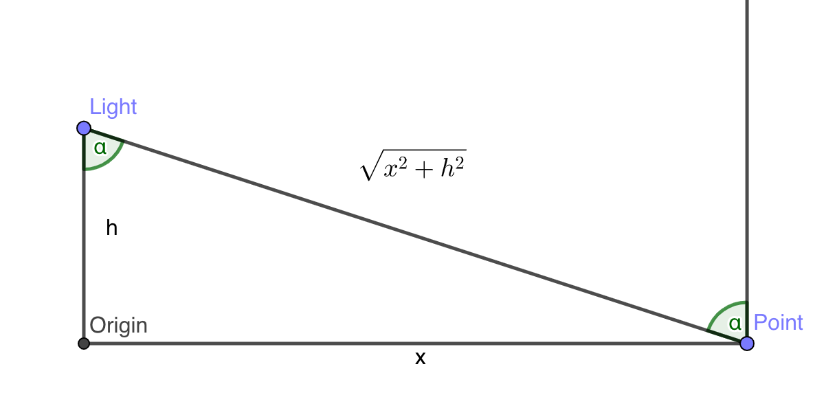or \(\ \frac{i\cdot h}{\sqrt{x^{2}+h^{2}}^{3}} \) where \(\ \sqrt{x^{2}+h^{2}} \) is the distance from the light.