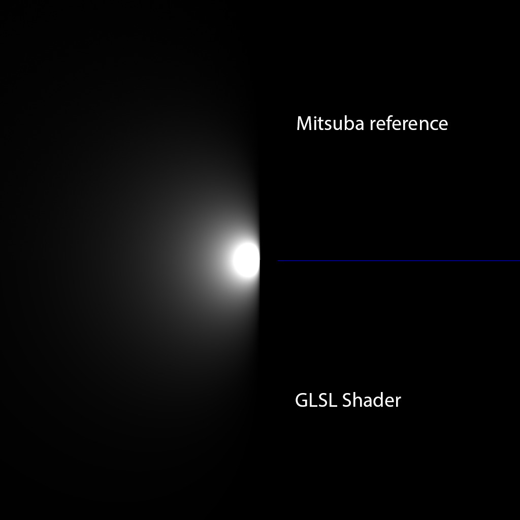 Visually the shader looks a bit brighter, but looking at the curves, it's clear that they are very different. The Mitsuba one has \(\ x^{-6} \) falloff while the shader is \(\ x^{-2} \).